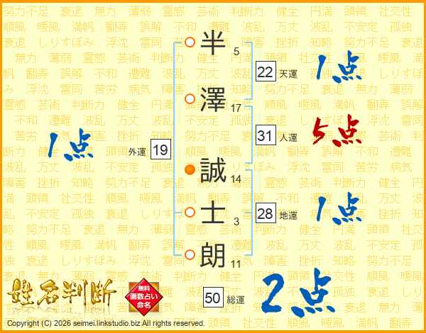 半(5画)澤(17画) 誠(14画)士(3画)朗(11画)