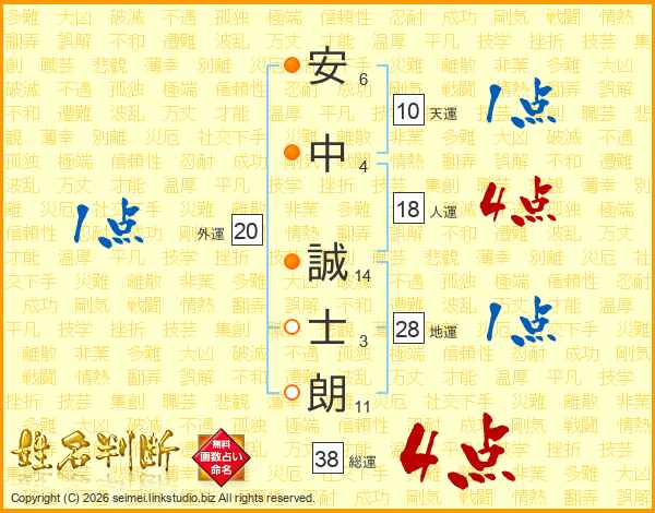 安(6画)中(4画) 誠(14画)士(3画)朗(11画)
