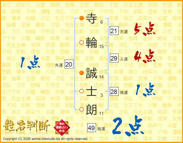 寺(6画)輪(15画) 誠(14画)士(3画)朗(11画)