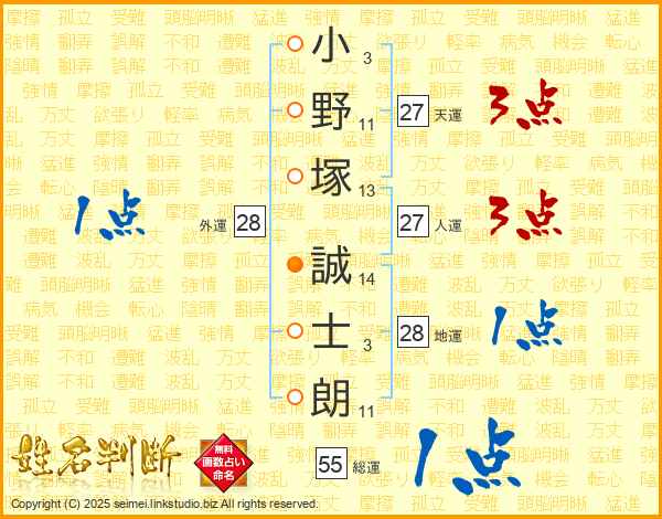 小(3画)野(11画)塚(13画) 誠(14画)士(3画)朗(11画)