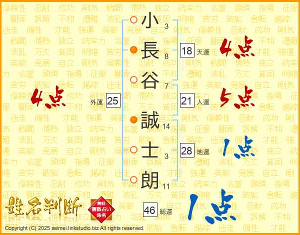 小(3画)長(8画)谷(7画) 誠(14画)士(3画)朗(11画)