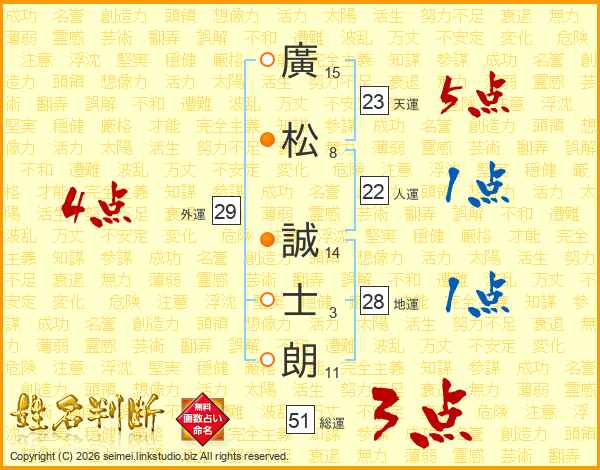 廣(15画)松(8画) 誠(14画)士(3画)朗(11画)
