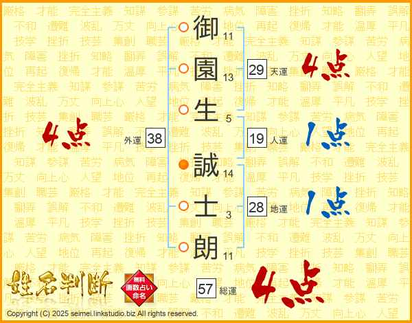 御(11画)園(13画)生(5画) 誠(14画)士(3画)朗(11画)