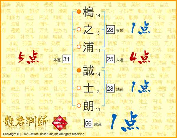 槝(14画)之(3画)浦(11画) 誠(14画)士(3画)朗(11画)