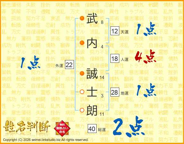 武(8画)内(4画) 誠(14画)士(3画)朗(11画)