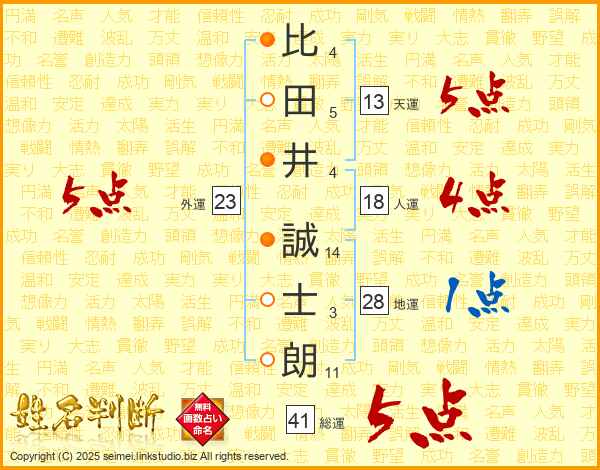 比(4画)田(5画)井(4画) 誠(14画)士(3画)朗(11画)