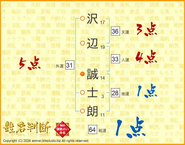 沢(17画)辺(19画) 誠(14画)士(3画)朗(11画)