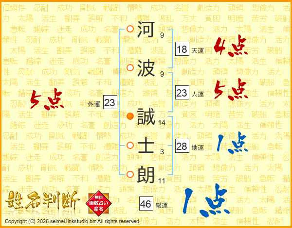 河(9画)波(9画) 誠(14画)士(3画)朗(11画)