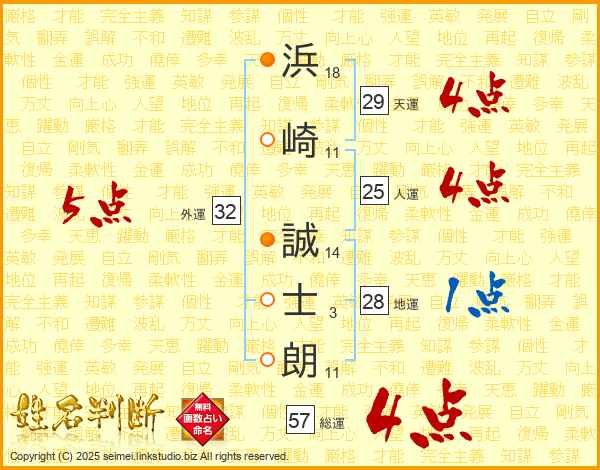 浜(18画)崎(11画) 誠(14画)士(3画)朗(11画)