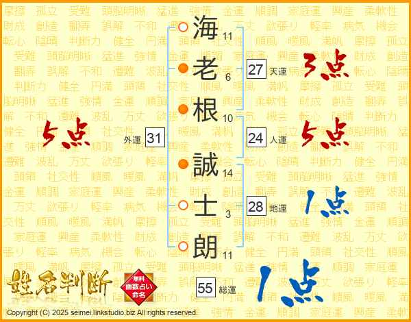 海(11画)老(6画)根(10画) 誠(14画)士(3画)朗(11画)