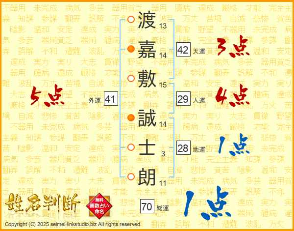 渡(13画)嘉(14画)敷(15画) 誠(14画)士(3画)朗(11画)