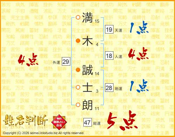 満(15画)木(4画) 誠(14画)士(3画)朗(11画)