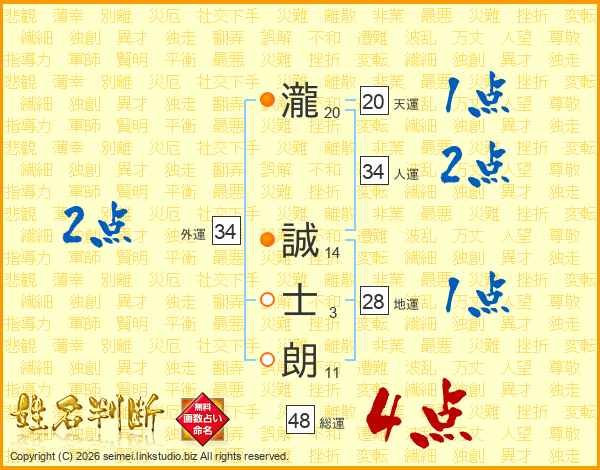 瀧(20画) 誠(14画)士(3画)朗(11画)