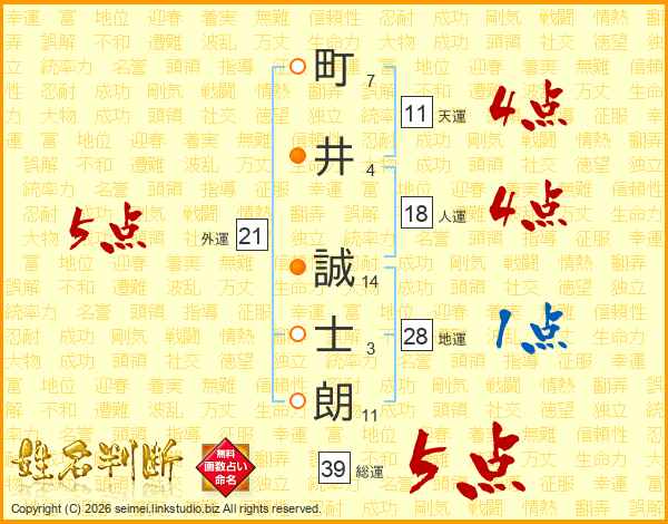 町(7画)井(4画) 誠(14画)士(3画)朗(11画)