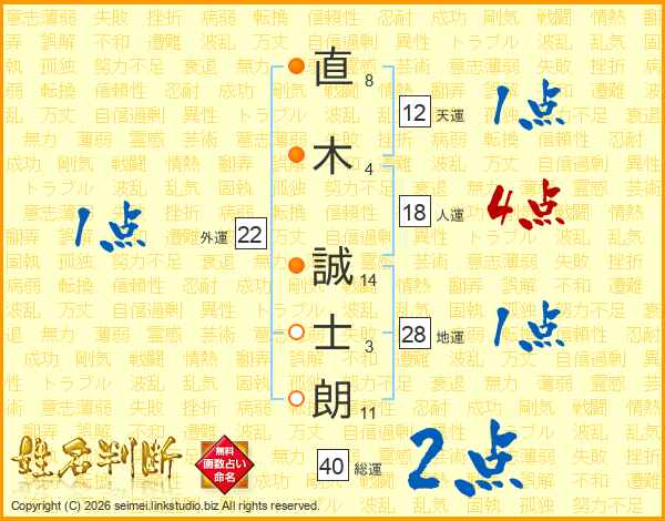 直(8画)木(4画) 誠(14画)士(3画)朗(11画)
