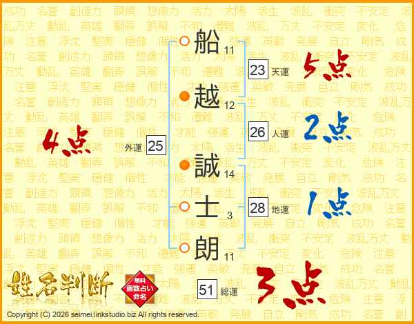 船(11画)越(12画) 誠(14画)士(3画)朗(11画)