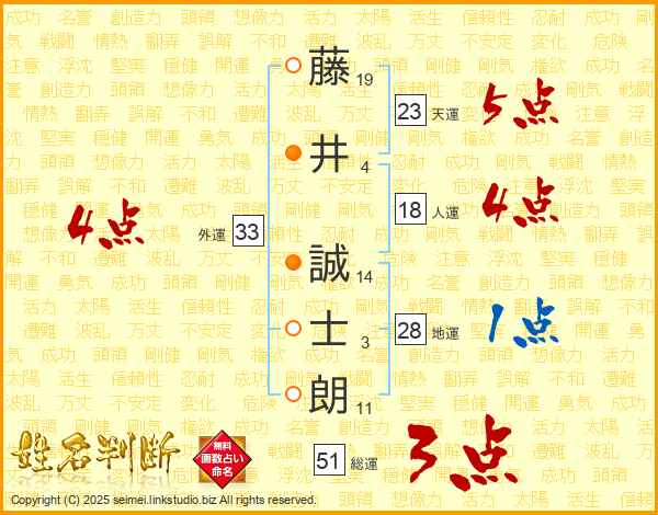 藤(19画)井(4画) 誠(14画)士(3画)朗(11画)