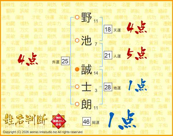 野(11画)池(7画) 誠(14画)士(3画)朗(11画)