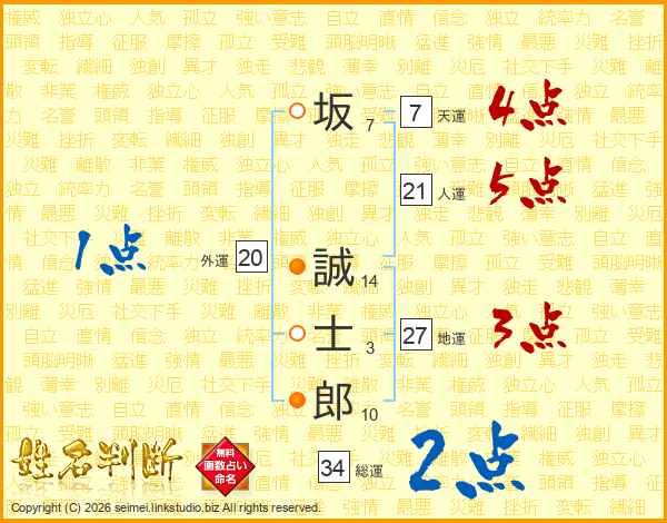 坂(7画) 誠(14画)士(3画)郎(10画)