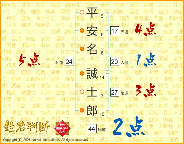 平(5画)安(6画)名(6画) 誠(14画)士(3画)郎(10画)