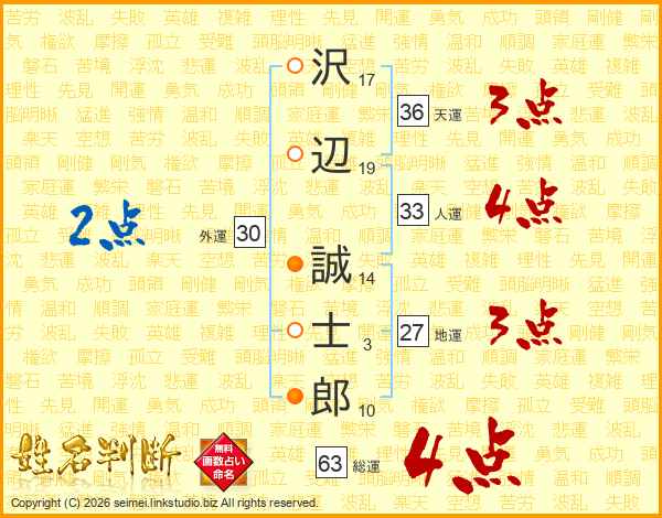沢辺誠士郎さんの総運は63画の4点!