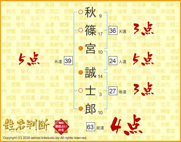 秋(9画)篠(17画)宮(10画) 誠(14画)士(3画)郎(10画)