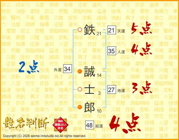 鉄(21画) 誠(14画)士(3画)郎(10画)