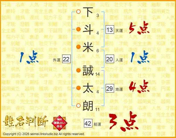 下(3画)斗(4画)米(6画) 誠(14画)太(4画)朗(11画)
