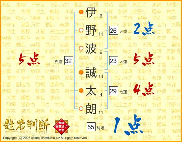 伊(6画)野(11画)波(9画) 誠(14画)太(4画)朗(11画)