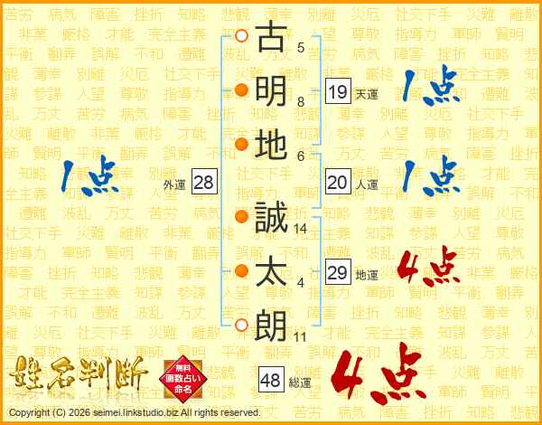 古(5画)明(8画)地(6画) 誠(14画)太(4画)朗(11画)