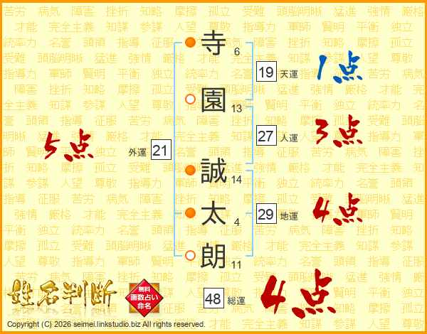 寺(6画)園(13画) 誠(14画)太(4画)朗(11画)