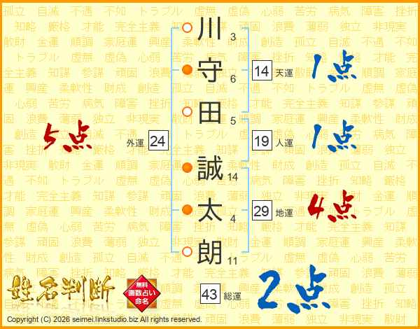 川(3画)守(6画)田(5画) 誠(14画)太(4画)朗(11画)