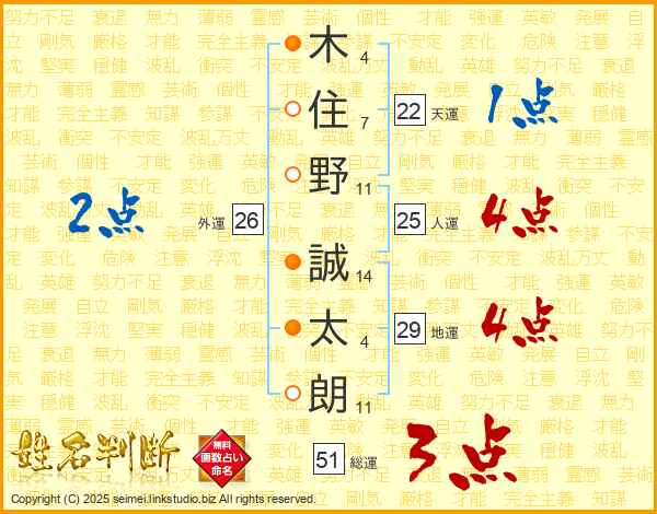 木(4画)住(7画)野(11画) 誠(14画)太(4画)朗(11画)