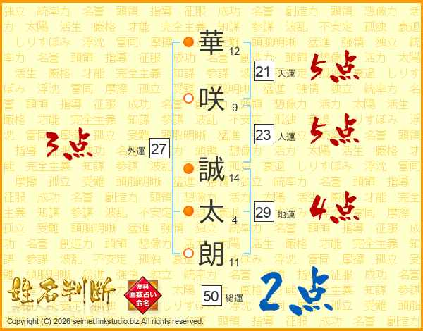 華(12画)咲(9画) 誠(14画)太(4画)朗(11画)