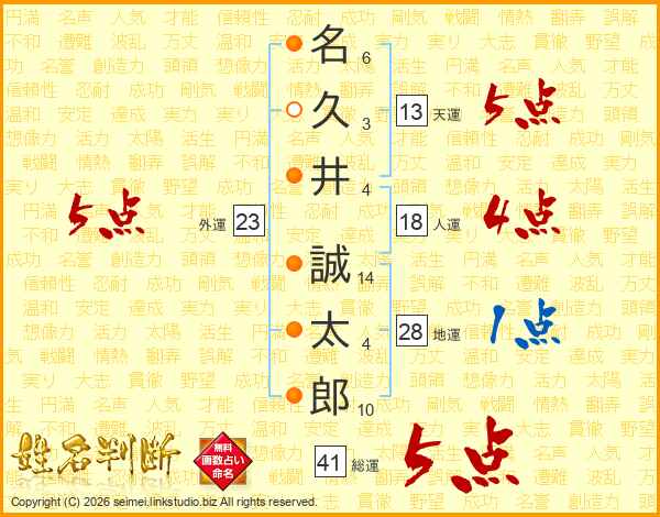 名(6画)久(3画)井(4画) 誠(14画)太(4画)郎(10画)