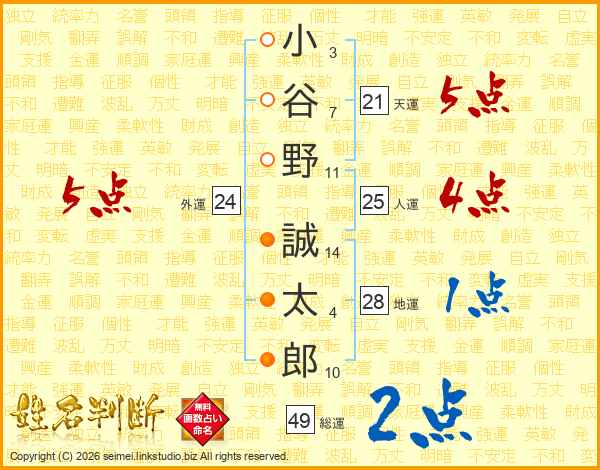 小(3画)谷(7画)野(11画) 誠(14画)太(4画)郎(10画)