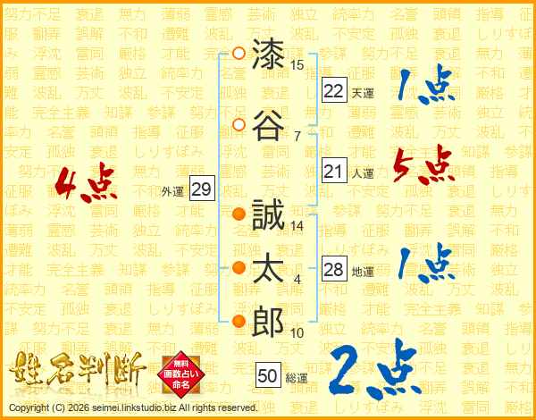 漆(15画)谷(7画) 誠(14画)太(4画)郎(10画)