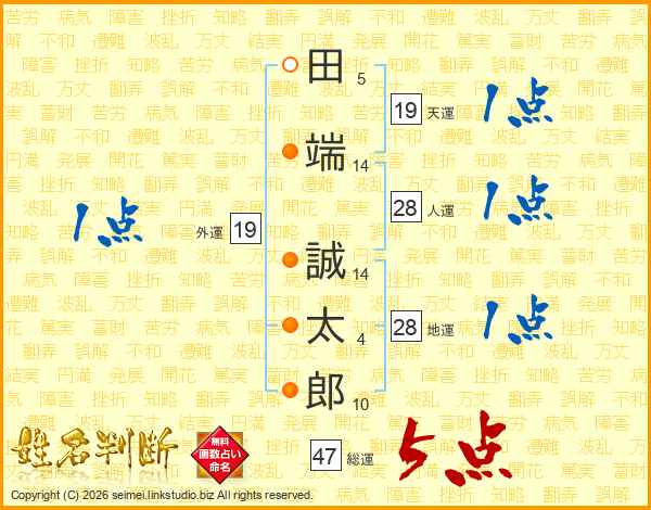 田(5画)端(14画) 誠(14画)太(4画)郎(10画)