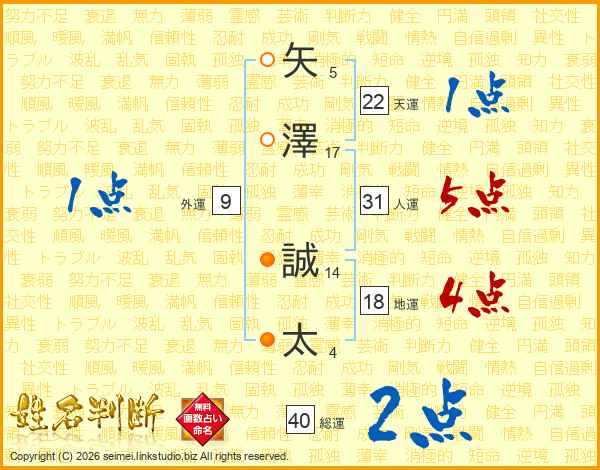 矢(5画)澤(17画) 誠(14画)太(4画)