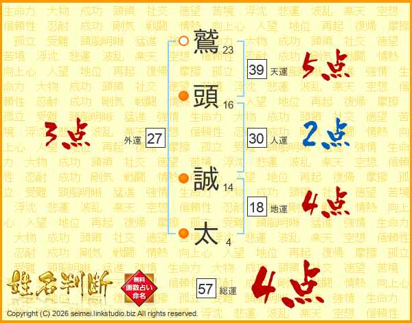 鷲(23画)頭(16画) 誠(14画)太(4画)