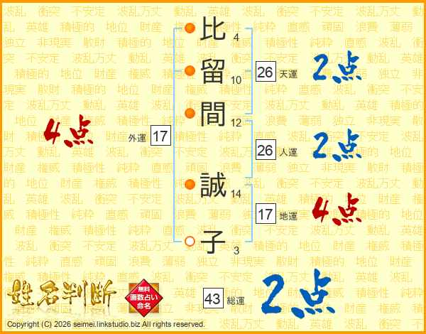 比(4画)留(10画)間(12画) 誠(14画)子(3画)