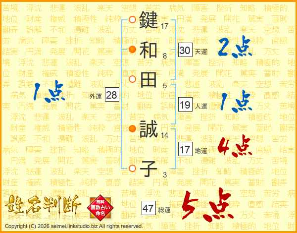 鍵(17画)和(8画)田(5画) 誠(14画)子(3画)