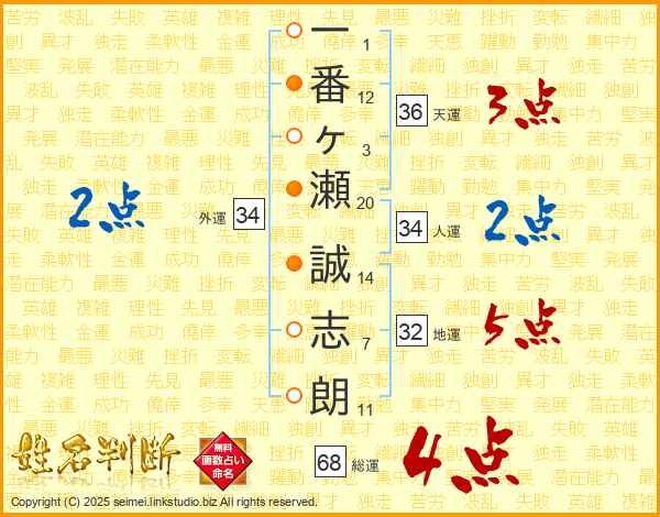 一番ヶ瀬誠志朗さんの総運は68画の4点!