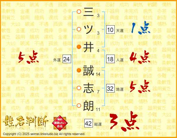三(3画)ツ(3画)井(4画) 誠(14画)志(7画)朗(11画)