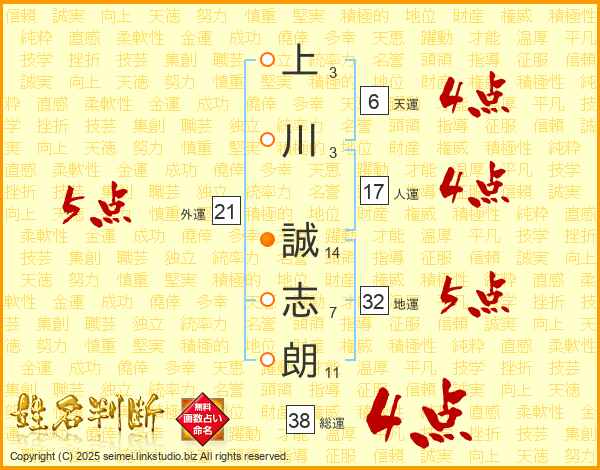 上(3画)川(3画) 誠(14画)志(7画)朗(11画)