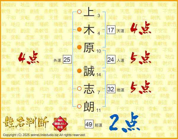 上(3画)木(4画)原(10画) 誠(14画)志(7画)朗(11画)