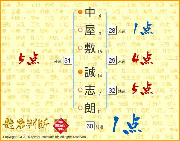 中屋敷誠志朗さんの地運は32画の5点!