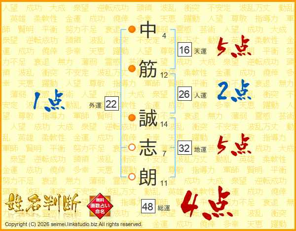 中(4画)筋(12画) 誠(14画)志(7画)朗(11画)
