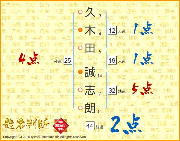 久(3画)木(4画)田(5画) 誠(14画)志(7画)朗(11画)