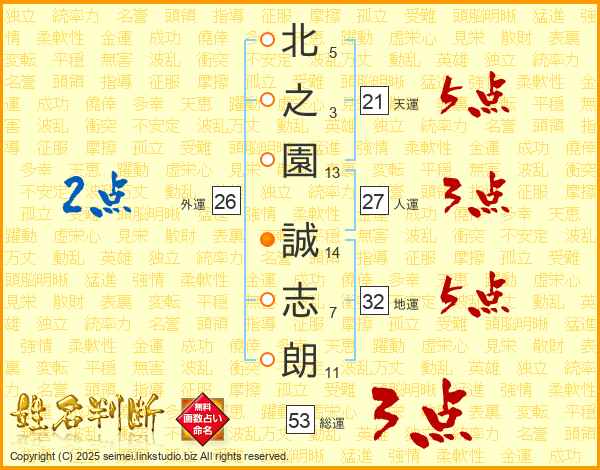 北(5画)之(3画)園(13画) 誠(14画)志(7画)朗(11画)